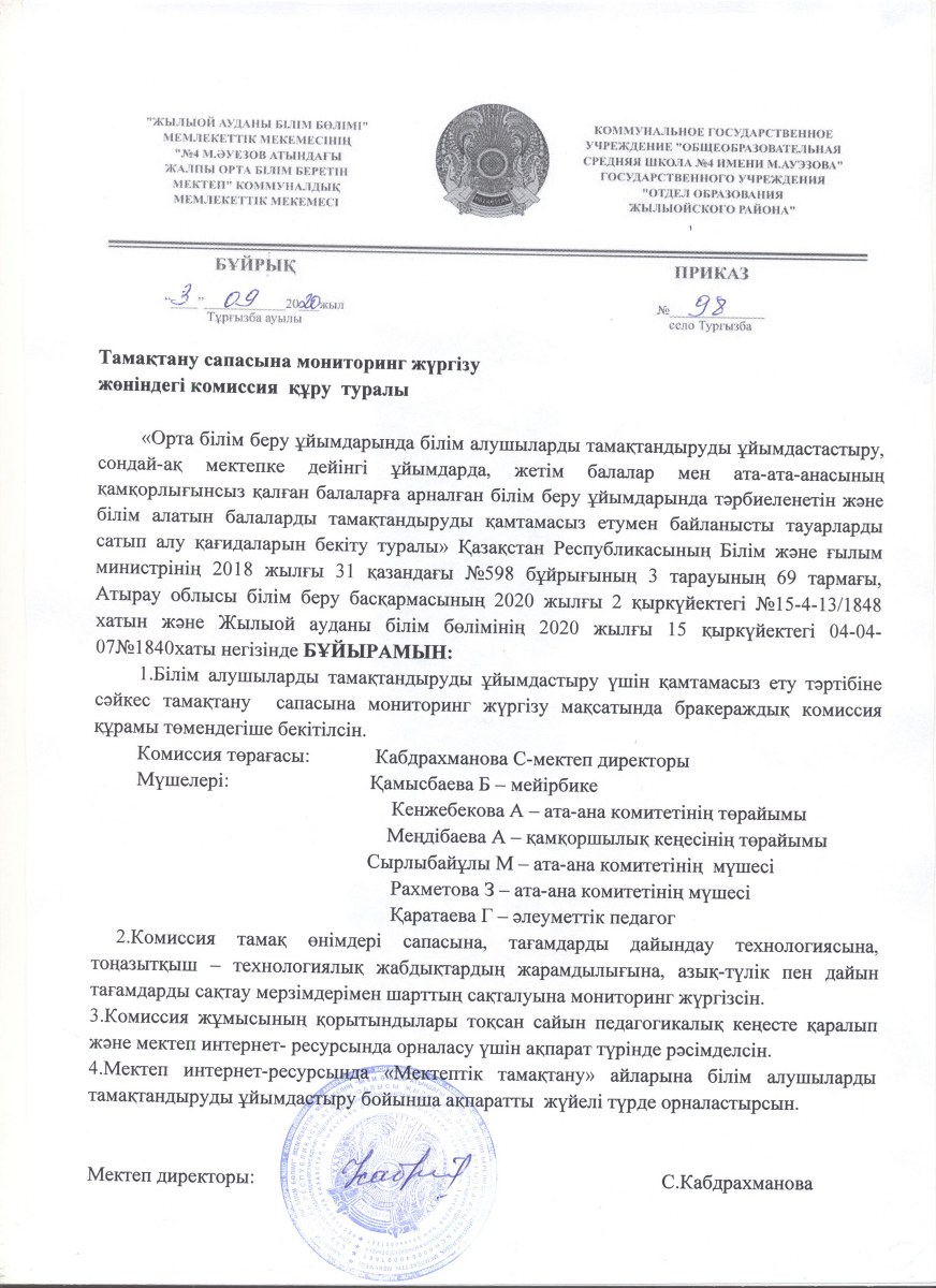 Тамақтану сапасына мониторниг жүргізу жөніндегі комиссия құру